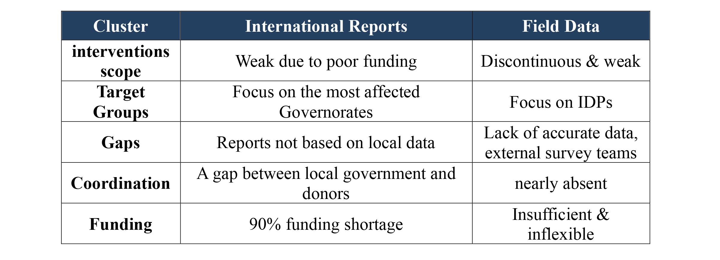 This analysis aims to highlight the differences and similarities in the scope and nature of humanitarian interventions between the three governorates, identify similarities and differences in field restrictions, response gaps, and the behavior of local and international activists in planning and implementation.