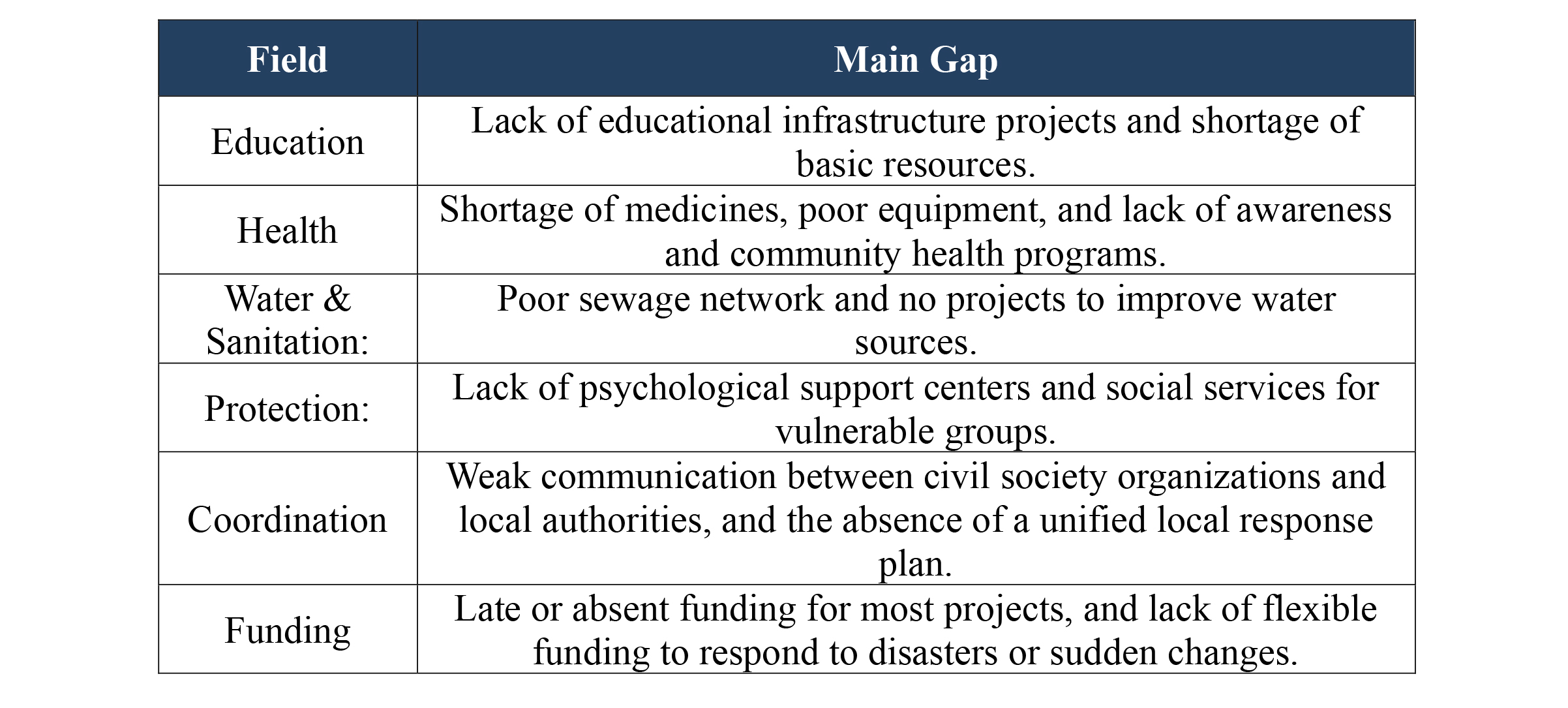- The absence of effective coordination mechanisms between active organizations and local authorities, and the weakness of joint initiatives, leading to duplication, overlap, or even a lack of intervention in some areas.