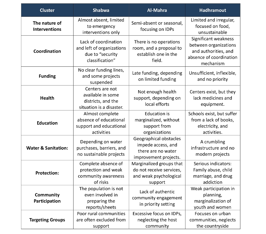This table shows the fundamental differences in humanitarian response between the Governorates: of Hadhramout, Al-Mahra, and Shabwa. While Hadhramout appears to be more present in some interventions, it suffers from a gap in quality and sustainability. As for Al-Mahra, it shows a case of geographic marginalization despite relative stability, with seasonal interventions that don’t take into account actual needs. Shabwah represents the greatest challenge, as its security classification has led to a near-total absence of response, deepening the crises in education, health, and water. The comparison shows that all governorates have in common weak funding, lack of coordination, and limited community participation, which requires a comprehensive review of priorities and humanitarian response planning in these areas.