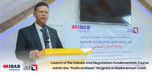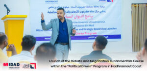 The Debate and Negotiation Fundamentals Course kicked off this morning as part of the “Political Diwan” program organized by the Midad Hadhramaut Center for Research and Strategic Studies, which aims to build a generation of young leaders capable of engaging in public affairs with competence and awareness.