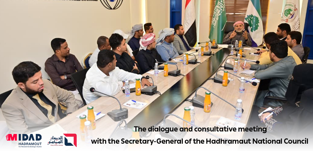 A dialogue meeting was held this morning bringing together members of the Political Diwan Program affiliated with the Midad Hadhramaut Center for Strategic Research and Studies and the Secretary-General of the Hadhramaut National Council, Mr. Issam Habreesh Al-Kathiri. The meeting was held as part of the Political Diwan Program’s activities aimed at engaging with political figures and leaders, and enhancing political dialogue with youth elites.