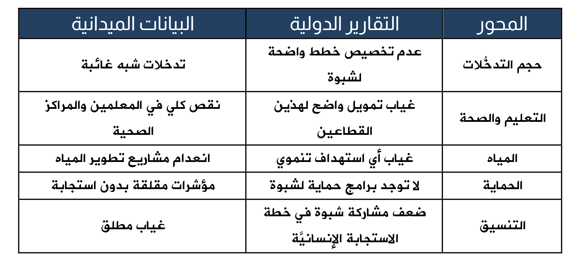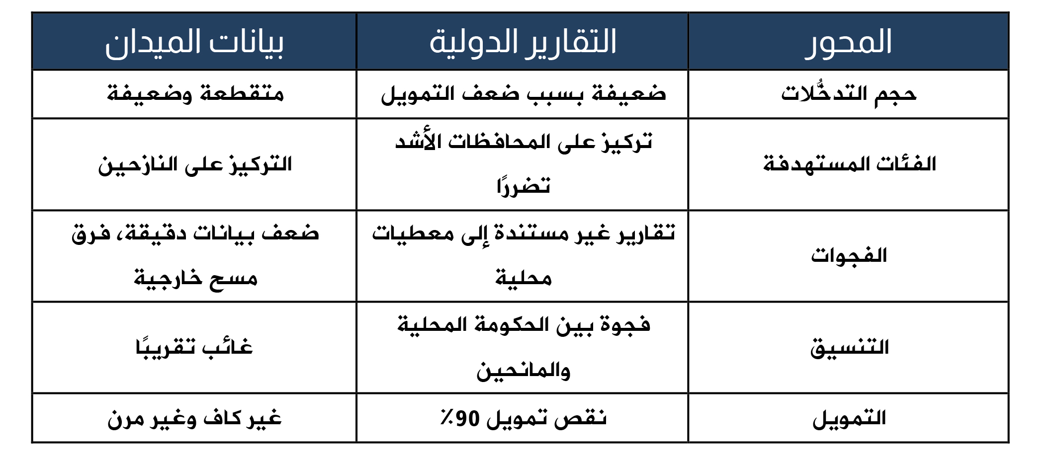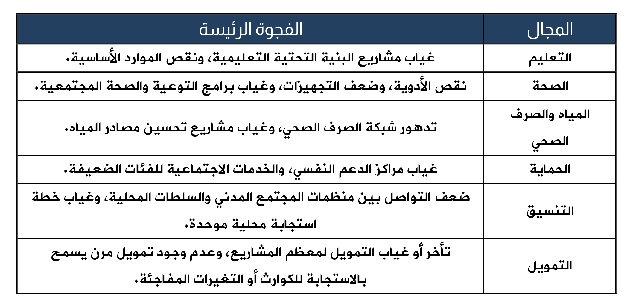 - معظم التدخُّلات تركز على الإغاثة، بينما تغيب المشاريع التنموية متوسطة أو طويلة الأجل، لا سيما في قطاعات التعليم، والصحة، وسبل العيش، وتمكين المجتمعات.