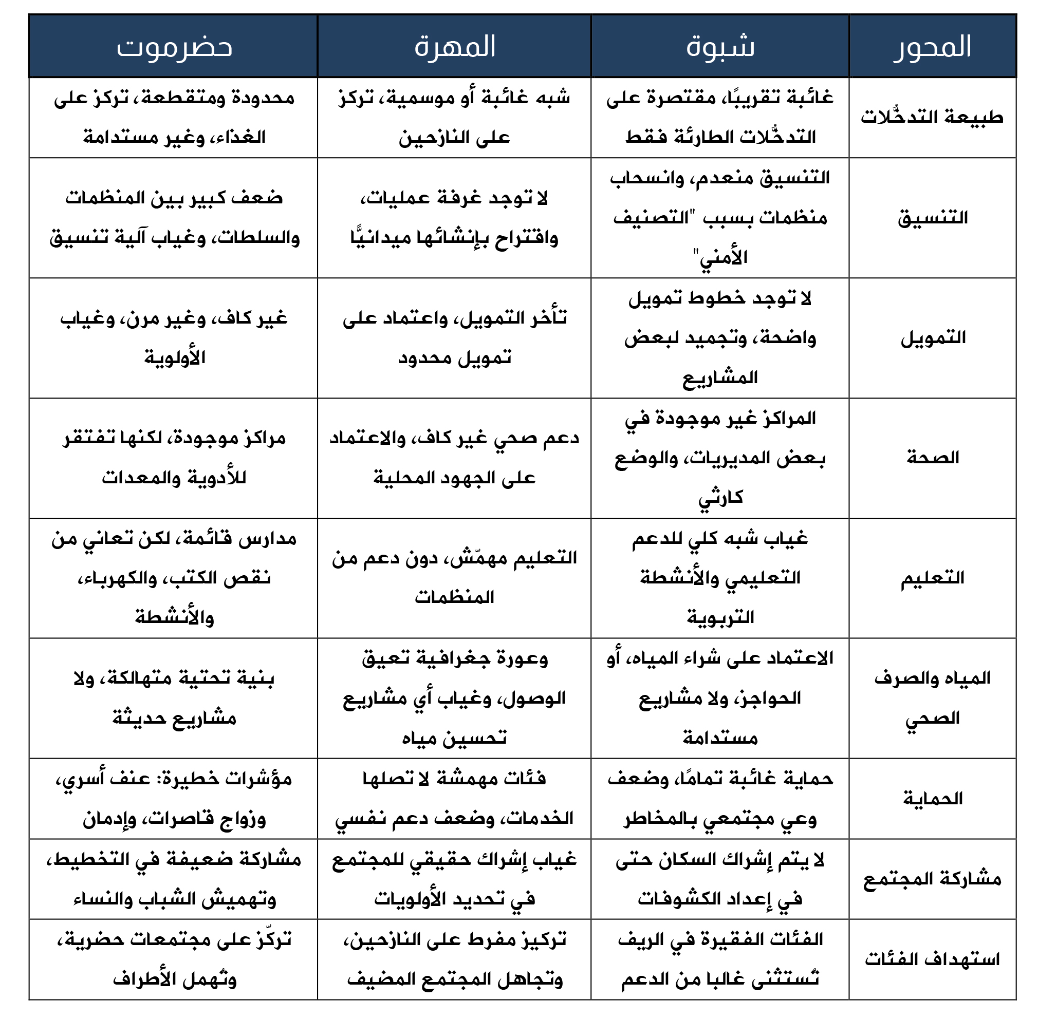 يظهر هذا الجدول التباينات الجوهرية في الاستجابة الإنسانيَّة بين محافظات حضرموت، والمهرة، وشبوة. ففي حين تبدو حضرموت أكثر حضورًا في بعض التدخُّلات، إلا أنها تعاني من فجوة في الجودة والاستدامة. أما المهرة، فتمثل حالة من التهميش الجغرافي رغم الاستقرار النسبي، مع تدخلات موسمية لا تُراعي الاحتياجات الفعلية. وتُجسد شبوة التحدي الأكبر؛ إذْ أدى تصنيفها الأمني إلى شبه غياب تام للاستجابة؛ مما عمّق أزمات التعليم، والصحة، والمياه فيها. وتوضح المقارنة أن جميع المحافظات تشترك في ضعف التمويل، وغياب التنسيق، ومحدودية مشاركة المجتمعات المحلية؛ مما يتطلب إعادة نظر شاملة في أولويات، وتخطيط الاستجابة الإنسانيَّة في هذه المناطق