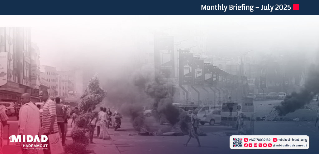 Hadhramout Governorate has seen some security developments, the most notable of which was a big meeting on July 19 between military and security leaders in the Dhubaisah area to demand the release of Brigadier General; Al-Yameni, describing his arrest as “illegal and based on revenge.” Security tensions escalated in the governorate when the commander of the First Brigade, Brigadier General Al-Jawid Salmin Barashid, survived an assassination attempt on July 25 after leaving Friday prayers. He was subjected to a barrage of gunfire that led to the death of one of his companions. However, forces were able to arrest the shooter after hours of pursuit. In Al-Mahra, the repercussions of the arrest of Houthi loyalist Sheikh; Mohammed Ahmed Ali Al-Zaidi at Sarfit Border Crossing on July 8 continued, leading to clashes that killed Colonel Abdullah Zayed. On July 16, Al-Mahra Governor Mohammed Ali Yasser held an important meeting with elders and prominent figures to contain the tension, emphasizing that Al-Zaidi’s arrest was part of legal proceedings and had no political motive, and that the local authority would not neglect the blood of the martyrs and would continue to pursue those who broke the law.