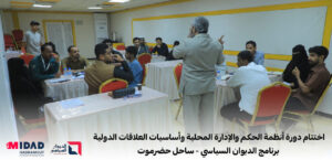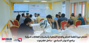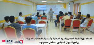 اختتم مركز مداد حضرموت للأبحاث والدراسات الاستراتيجية الدورة التدريبية “أنظمة الحكم والإدارة المحلية وأساسيات العلاقات الدولية” لأعضاء برنامج الديوان السياسي – ساحل حضرموت.
